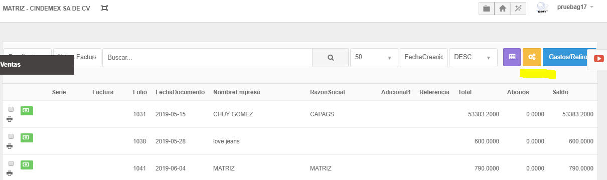 En este ejemplo vemos el listado de compras por pagar al dar clic en el botón "Configuraciones" aparece la siguiente ventana: