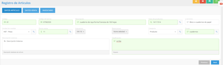 Llene los campos necesarios de la primera pestaña (DATOS ARTICULO) para hacer el registro de su articulo, una vez hecho esto llene los campos de la siguiente pestaña (DATOS VENTA) y en caso de ser necesario llene la última pestaña (INVENTARIO).