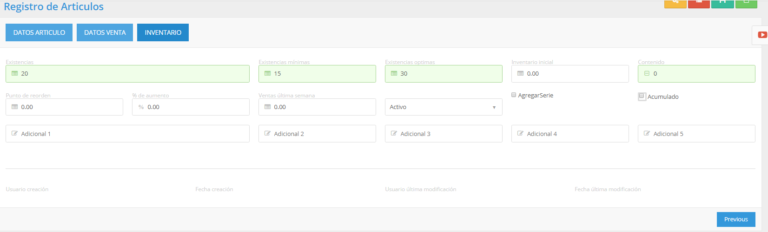 Si quiere llevar un inventario cada vez que va a agregar un articulo nuevo, puede hacerlo al registrarlo, como se muestra en la siguiente imagen (en la pestaña INVENTARIO) teclea las existencias con las que entrará al inventario, y si su organización lo requiere puede llevar un stock, agregando sus existencias mínimas u óptimas.