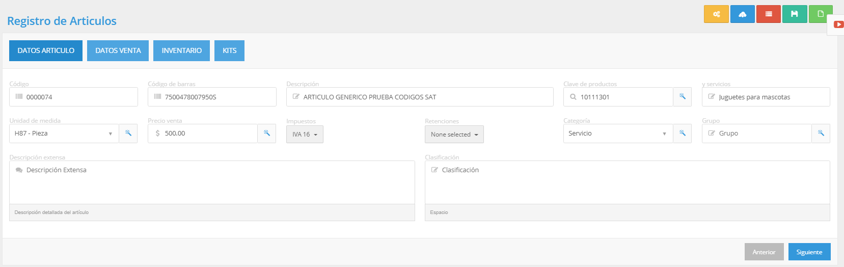 - Llene los campos necesarios de la primera pestaña (DATOS ARTICULO) para hacer el registro de su articulo, una vez hecho esto llene los campos de la siguiente pestaña (DATOS VENTA) y en caso de ser necesario llene la última pestaña (INVENTARIO).