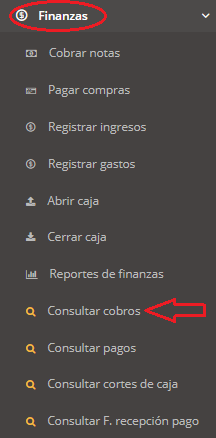 - Para consultar los cobros realizados e imprimirlos, diríjase al modulo de «finanzas» y seleccione de su listado; «consultar cobros»