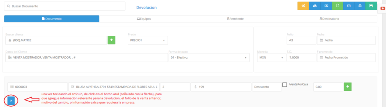 En el cuadro azul «descripción complementaria» agregue el folio de la venta y el motivo de la devolución.
