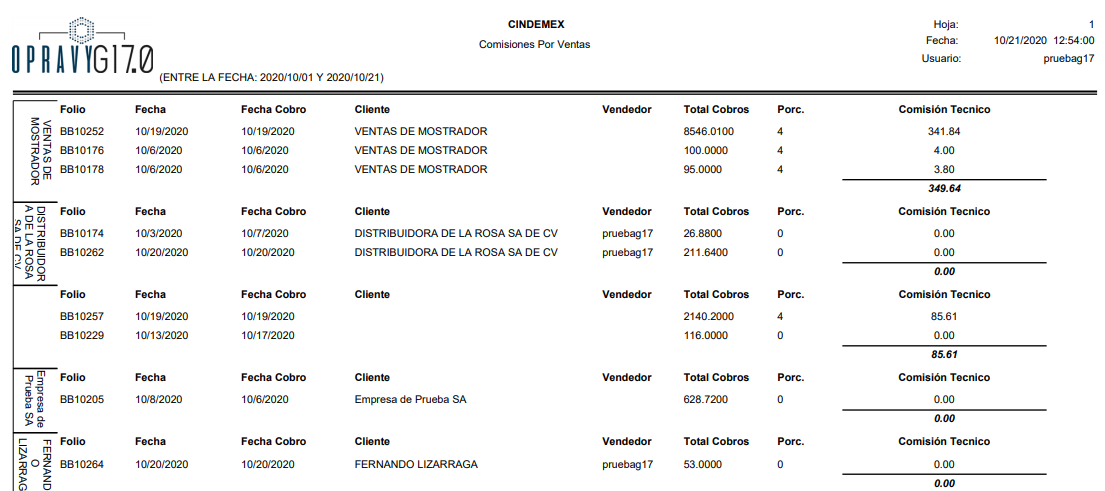 Este reporte nos permite revisar las comisiones generadas por ventas, este incluirá el porcentaje y la comisión técnica, para poder calcular esta se toma como base los días de crédito que tenga nuestro cliente siguiendo los siguientes parámetros