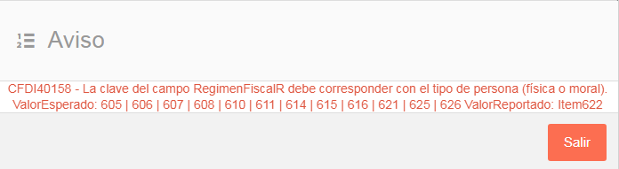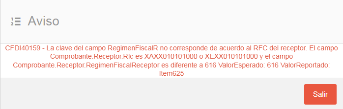 CFDI40159- Este campo nos indica que si tenemos un RFC generico no podemos asignnar cualquier Regimen Fiscal y este no corresponde al cliente.