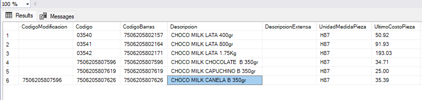 En este ejemplo el articulo "CHOCO MILK CANELA B 350gr" tiene el codigo del "CHOCO MILK CHOCOLATE B350gr" en el campo "CodigoModificacion"