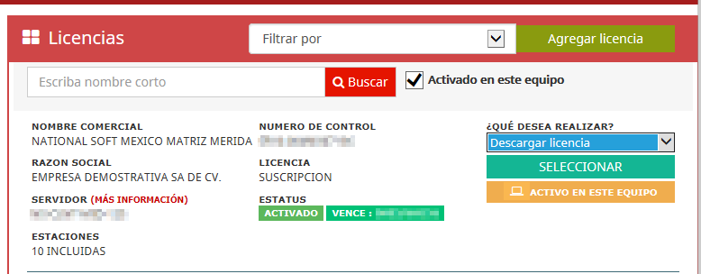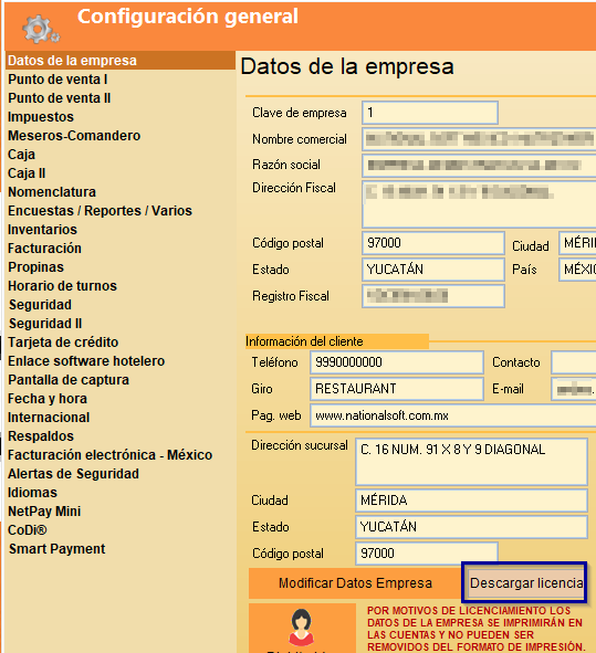 En donde nos apertura una ventana en la cual por defaul se carga en la 1a opcion que es Datos de Empresa, en esta misma ventana , en la parte de abajo se encuentra un boton que refiere a Descargar Licencia.